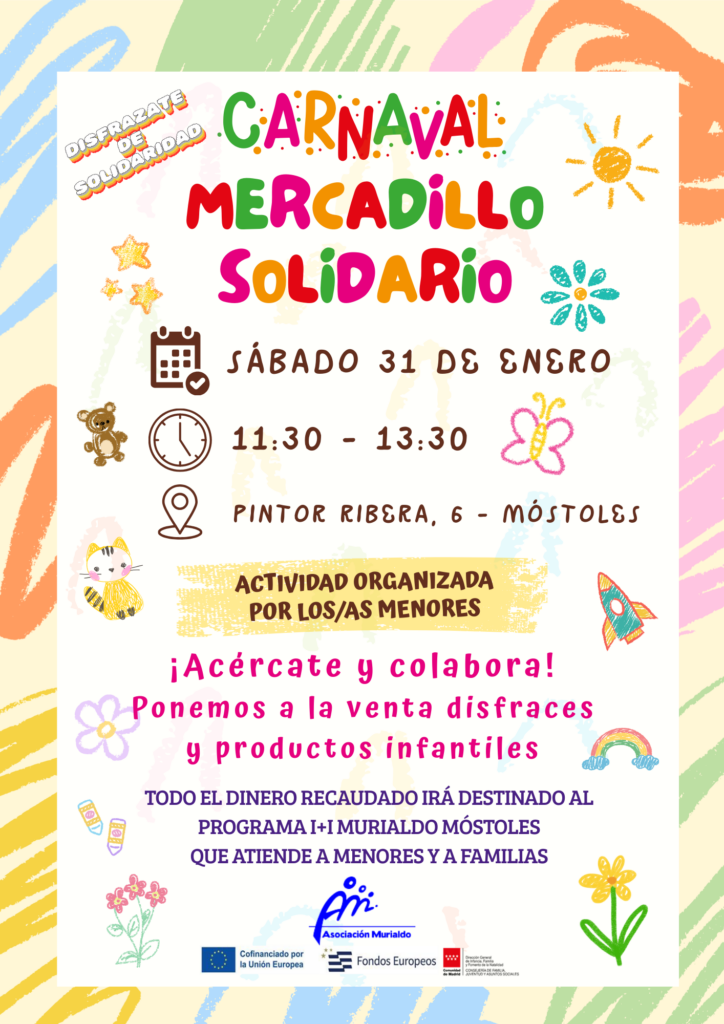 El Centro I+I de Murialdo Móstoles organizará un mercadillo solidario de Carnaval el próximo sábado 31 de enero, en horario de 11:30 a 13:30 horas, en sus instalaciones situadas en la calle Pintor Ribera, 6, en Móstoles.