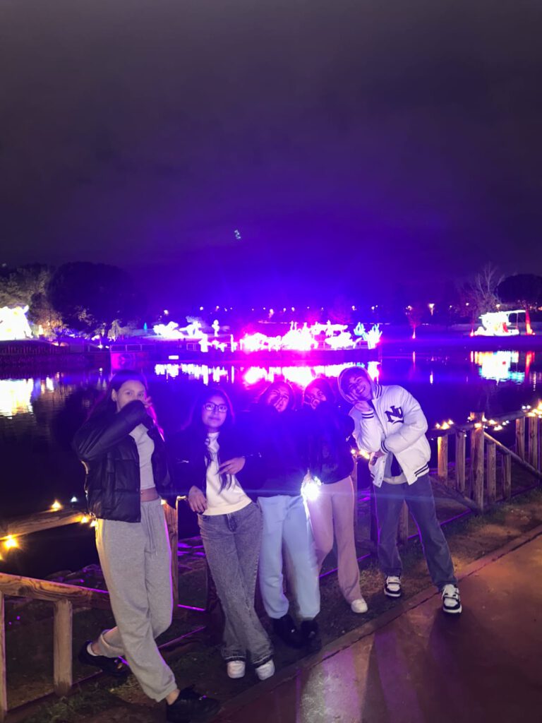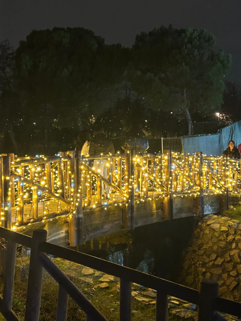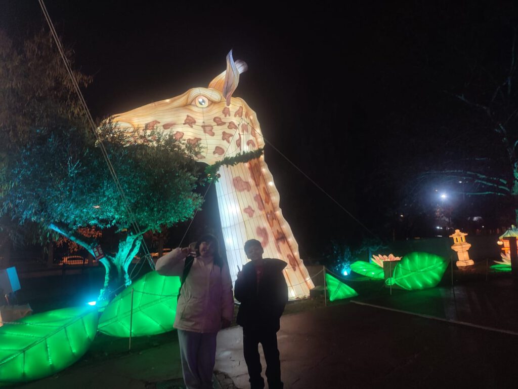 Durante el recorrido, los participantes de la Asociación Murialdo pasearon por una recreación de la sabana, donde pudieron observar animales como cebras y gacelas. La experiencia continuó con un viaje simbólico hasta el Himalaya, en el que se descubrieron osos pandas representados mediante impresionantes figuras luminosas.