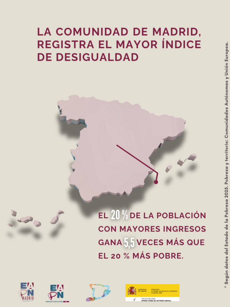 Desde EAPN Madrid ponemos el foco en los datos de desigualdad que soporta nuestra Comunidad que registra la mayor desigualdad de rentas del país, con un índice de Gini[1] de 31,8. El 20 % de la población con mayores ingresos gana 5,5 veces más que el 20 % más pobre. Queremos insistir en que el mero crecimiento económico no es suficiente para garantizar condiciones de vida digna a todas las personas. Es relevante que, a pesar de registrar una de las rentas medias por persona más altas del país (€17.275) y de tener un PIB per cápita muy elevado, es una de las comunidades que presenta un Índice de Gini más alto, situándose por encima de la media estatal (31,2).